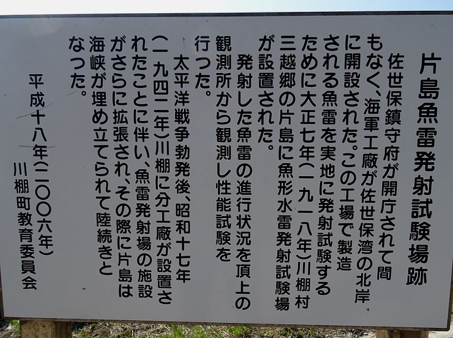 本部棟の側に説明板が立っている。片島はその名のとおり島だった。第二次世界大戦が勃発し1942年に川棚に軍事施設が設置されたことにより魚雷施設が拡張、陸続きとなった。